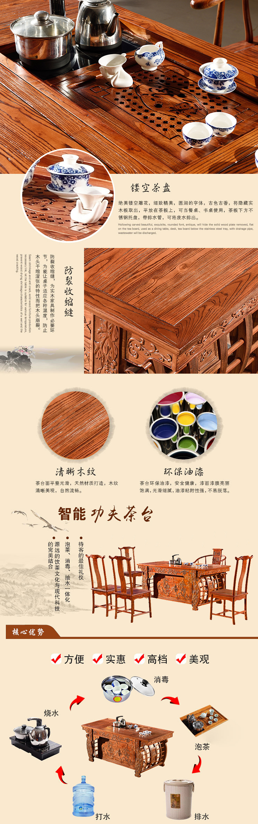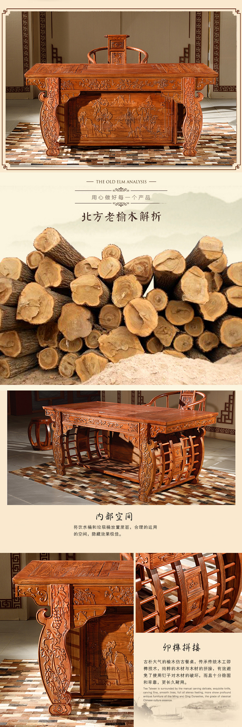 2.产品简介:这款星河中式老榆木山水茶桌,具有多功能的使用性,茶台桌面平整、色泽亮丽、设计灵活,办公休闲两用皆宜,可以当茶台使用,也可以用来当办公桌或茶台使用。此款老榆木休闲茶桌采用手工 雕刻,图案栩栩如生给茶桌添加一份韵味。这款中式老榆木茶桌茶台承重厚重,木质坚硬、结实牢固,承重力 强、使用寿命长。这款老榆木茶桌茶台有着干净利落的刀法、均匀细腻的上漆、紧密稳固 的拼接,实属佳品。