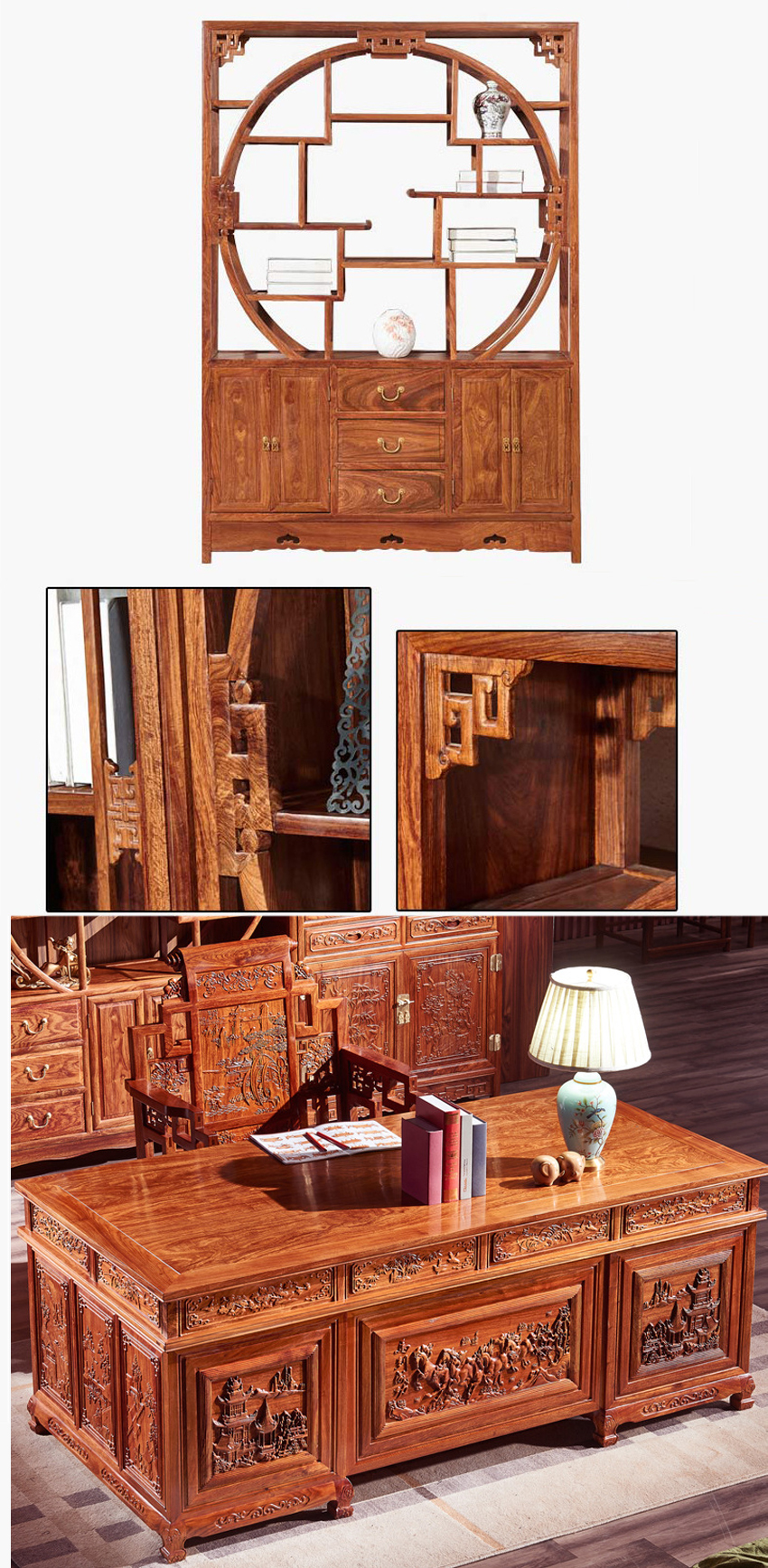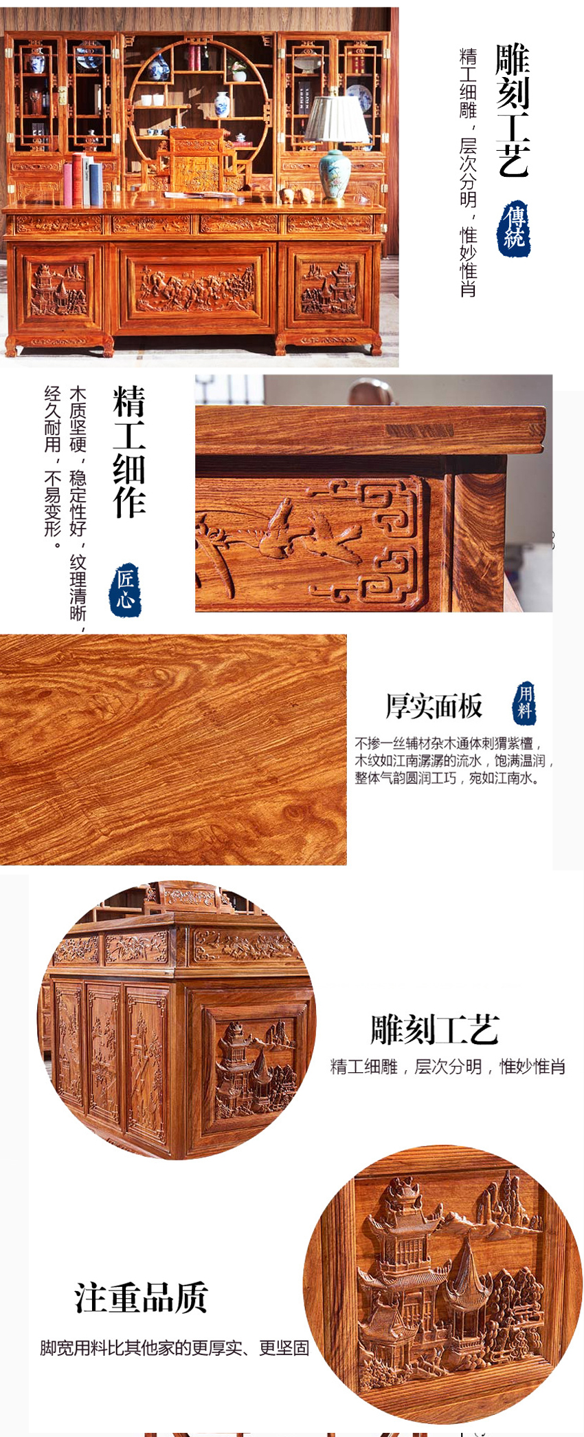 4. 产品简介:好产品关注每一个细节,这款老榆木现代中式写字台有着的雕刻工艺,纹理沉着、美观大气,造型线条流畅手感顺滑,富有诗情画意之美。