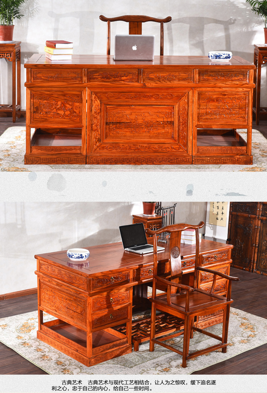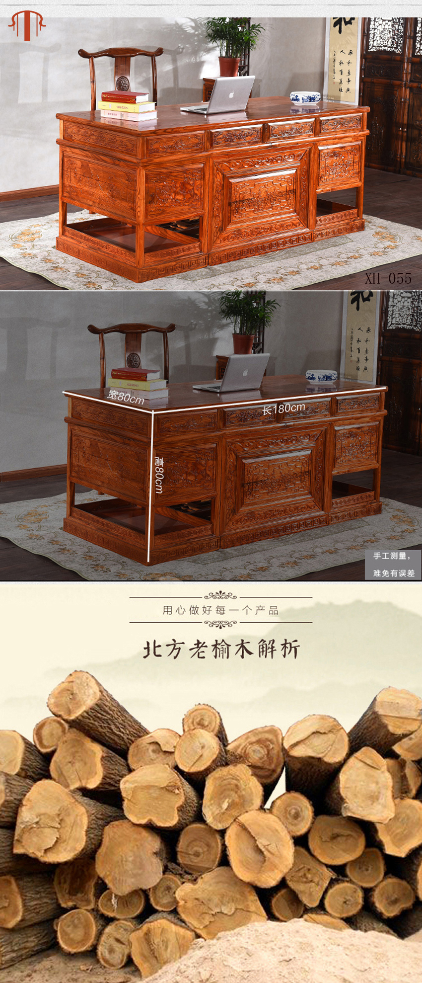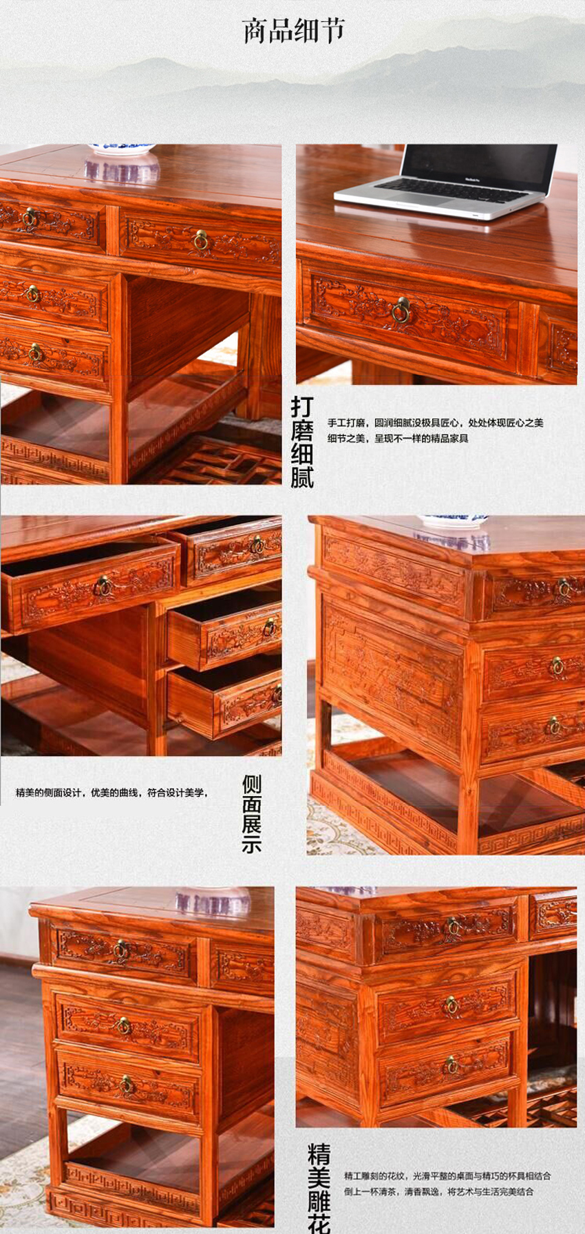 4. 产品简介:这款老榆木写字台是星河家具的 款式,好产品关注每一个细节,的雕刻工艺,纹理沉着、美观大气,摆放在办公室彰显风范。