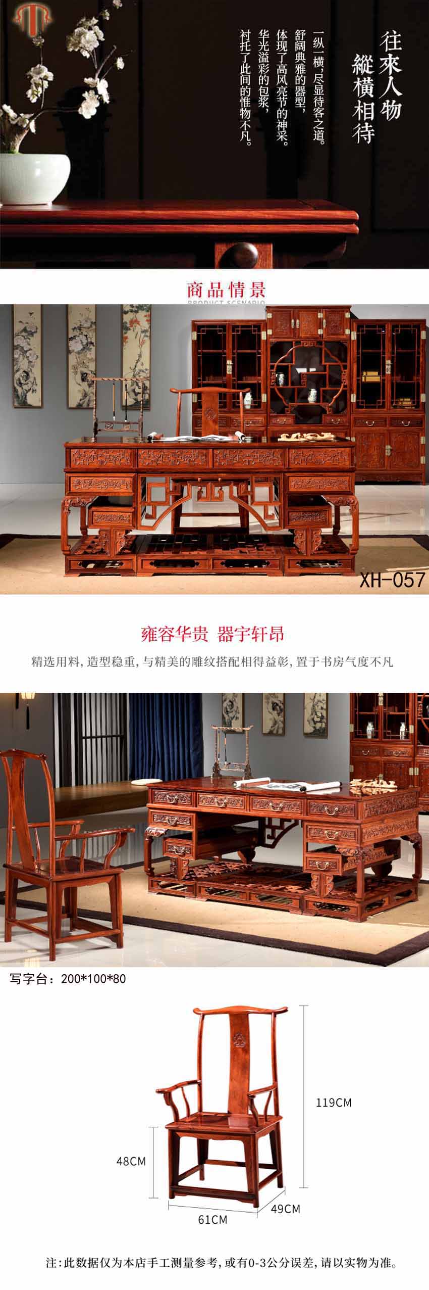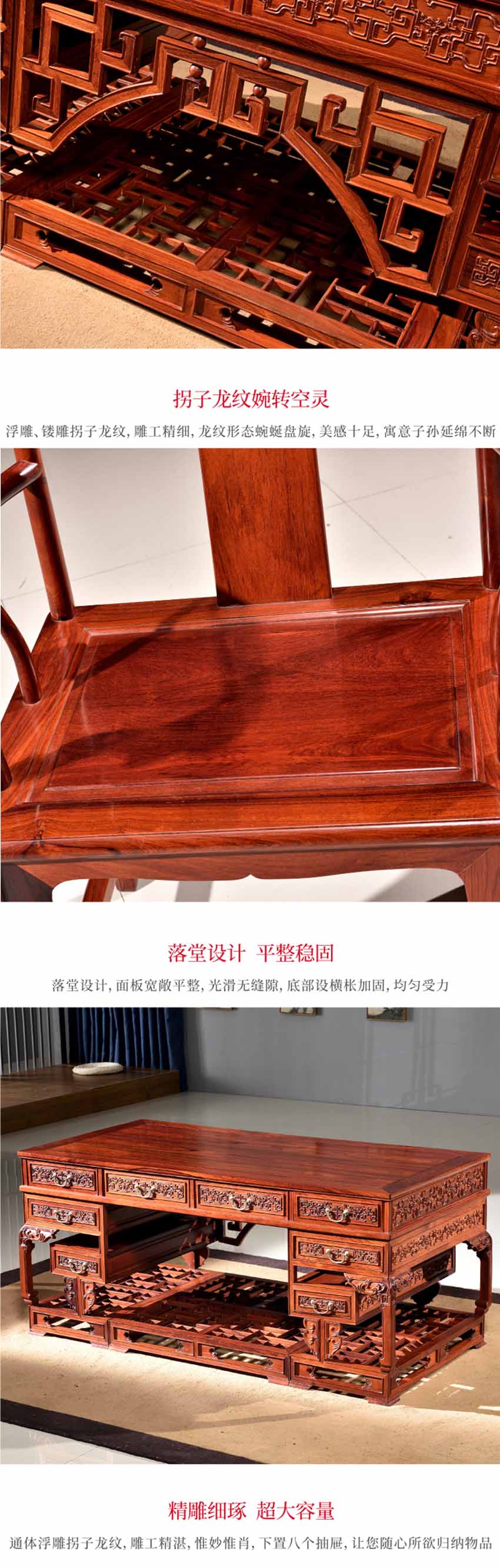 4. 产品简介:好产品关注每一个细节,这款老榆木现代中式写字台有着的雕刻工艺,纹理沉着、美观大气,造型线条流畅手感顺滑,富有诗情画意之美。