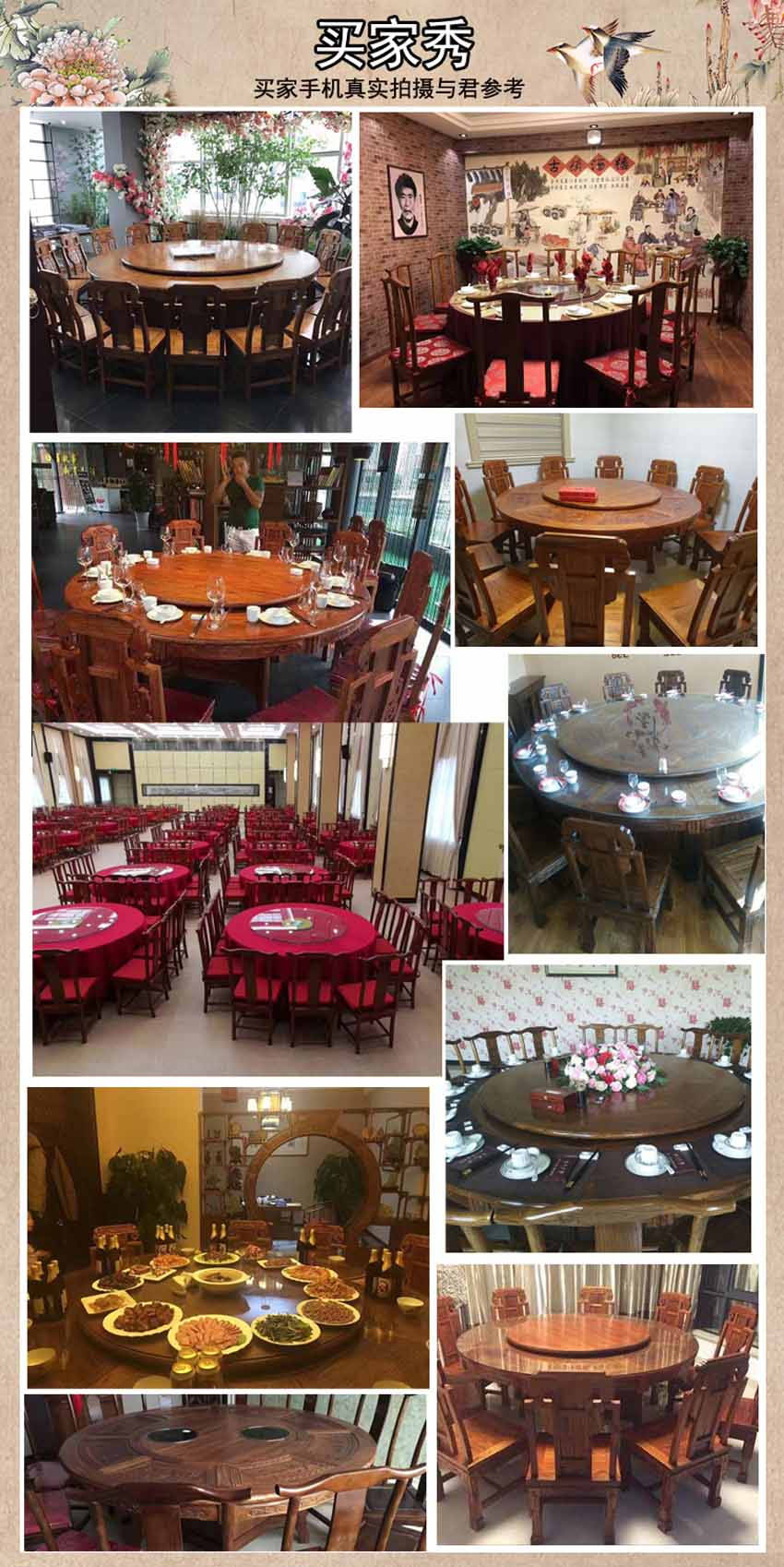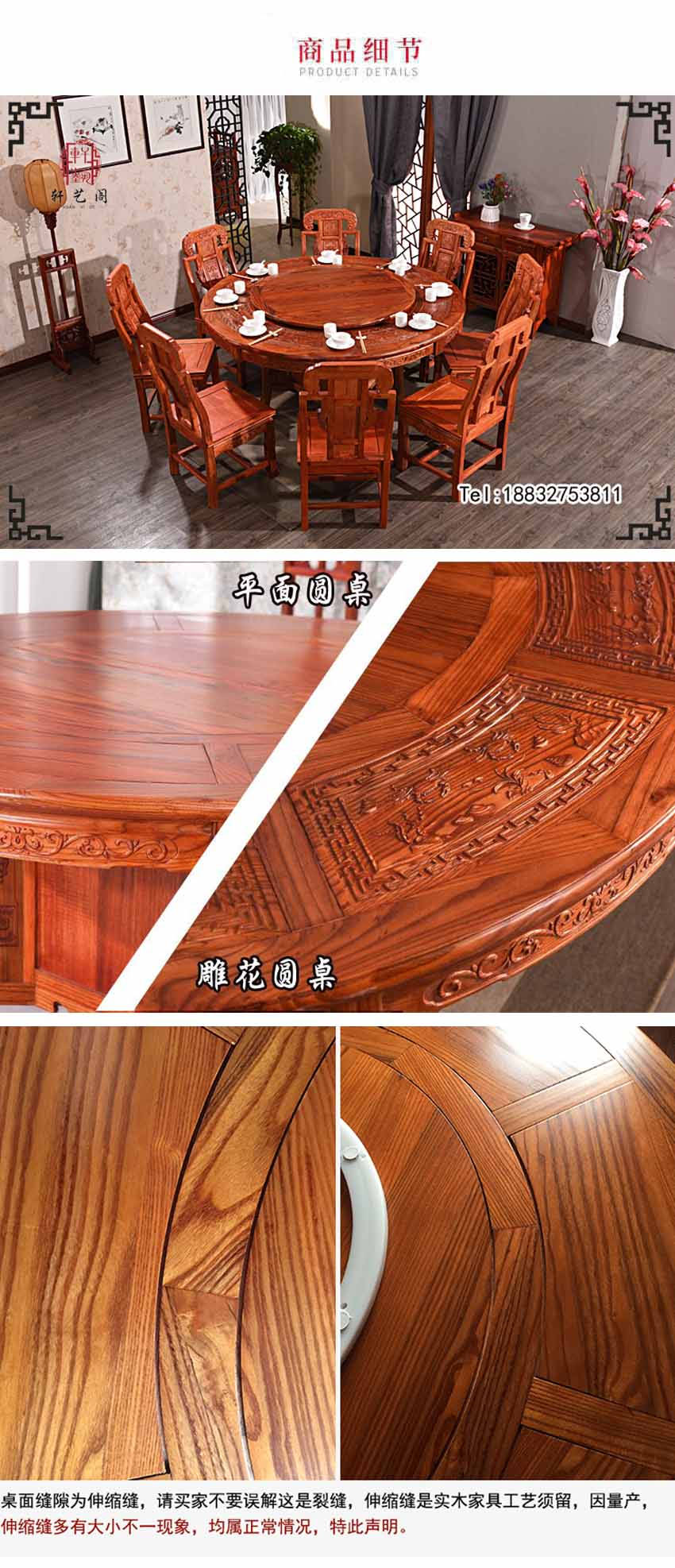 3. 产品简介:这款老榆木餐桌尺寸可定制,是酒店,宾馆常用的款式,适合6-8人就餐使用。沧州星河老榆木家具厂, 从事老榆木酒店餐桌椅批发。