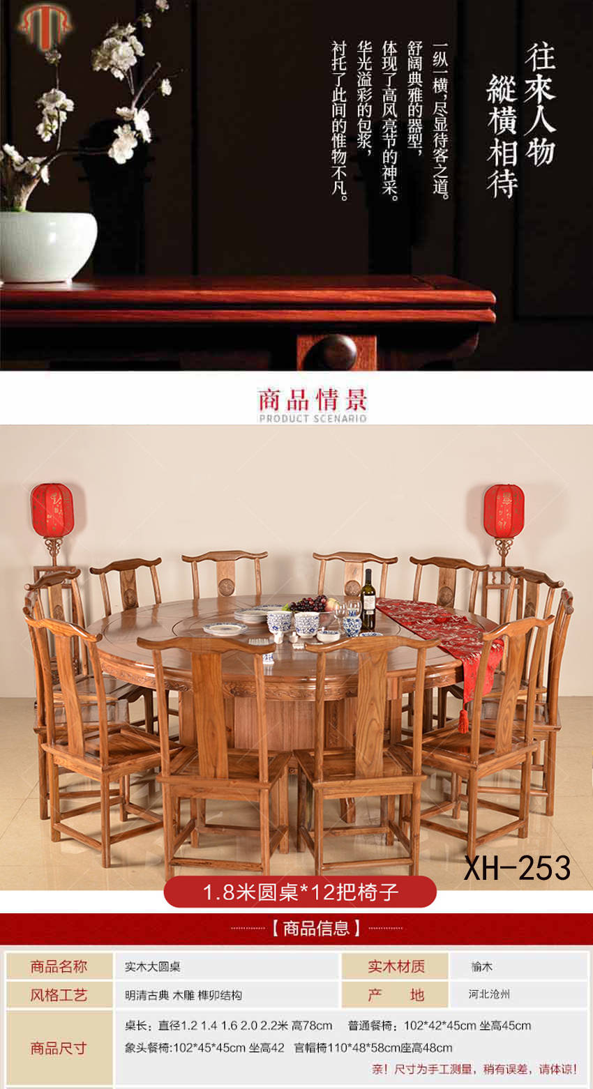 3. 产品简介:此款老榆木转台,桌面转盘灵活结实,方便摆放菜品,实木箱体造型美观,桌裙子雕花,给人一种古典的美感,是中式榆木圆形餐桌的选择。