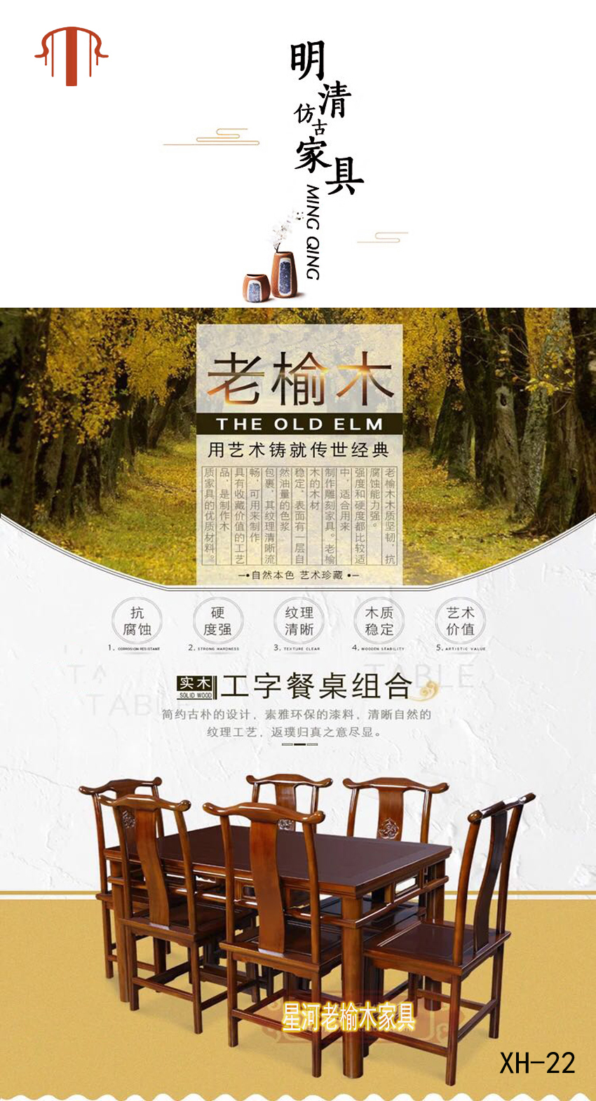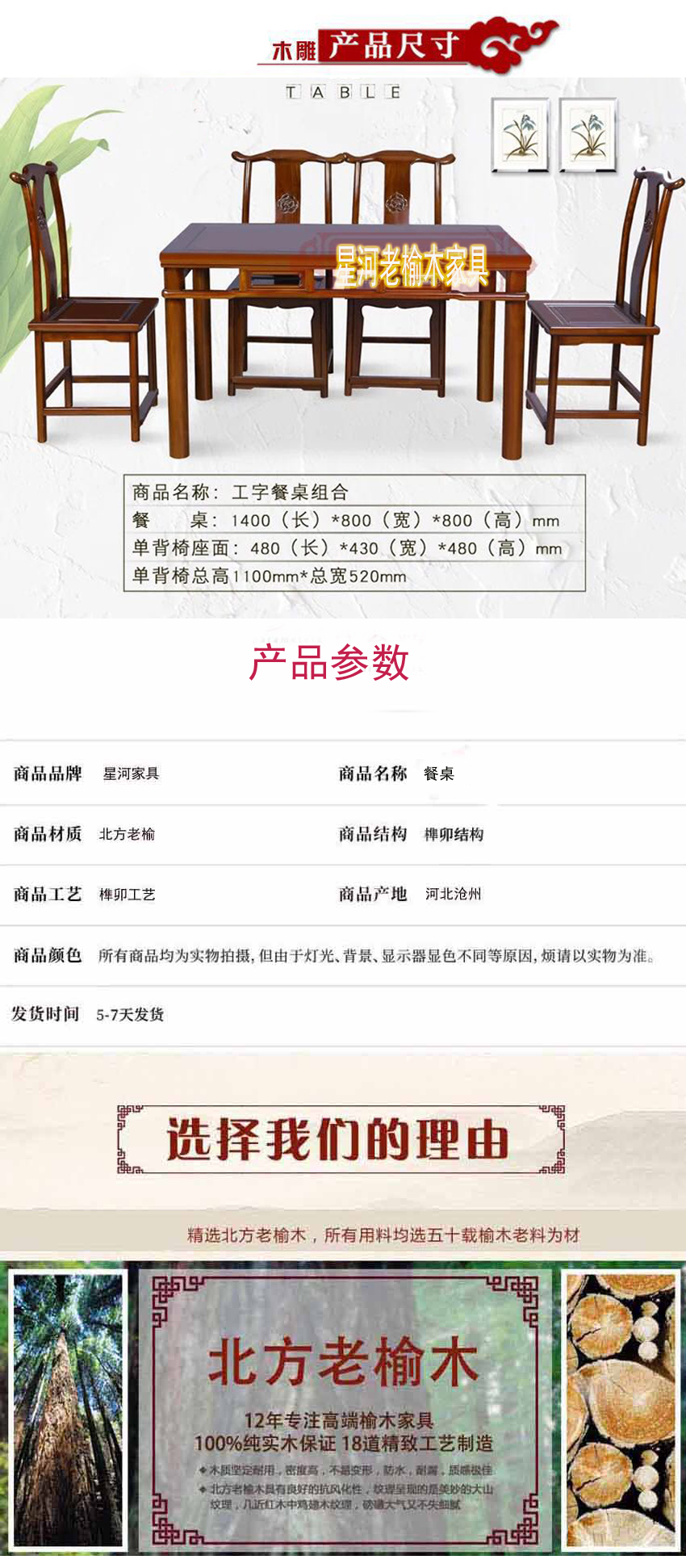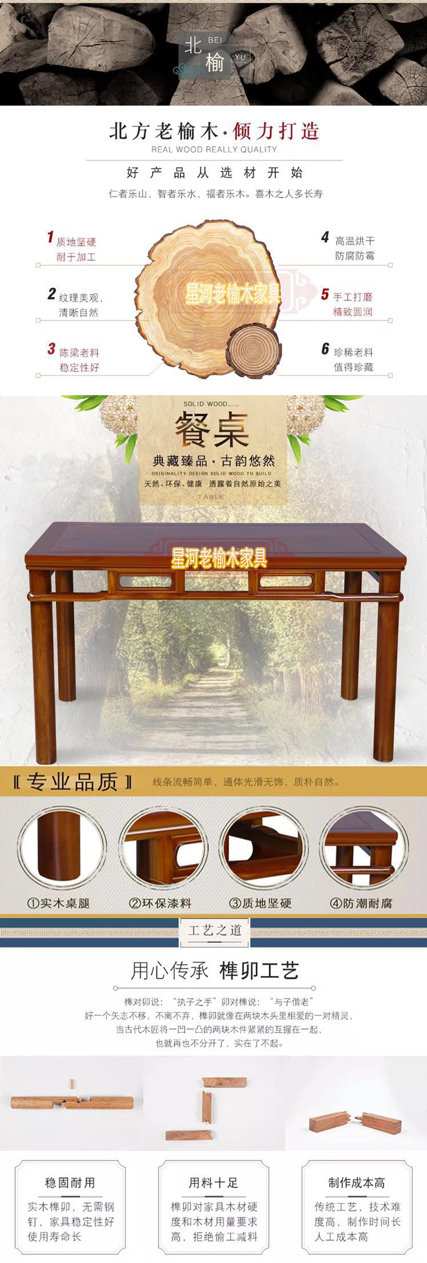 4. 产品简介:这款由星河老榆木餐桌厂生产的精美老榆木雕花长条桌,型号为:XH餐桌100,有着宋代长条桌的明显特点,桌子和腿之间有牙子装饰,造型清秀,选用 北方老榆木,桌面标准的伸缩缝,加上侧围 精美的雕花,让这款古典老榆木餐桌成为 。沧州星河老榆木家具厂,二十年来 制作生产榆木实木家具,服务上万客户,大 值得信赖。