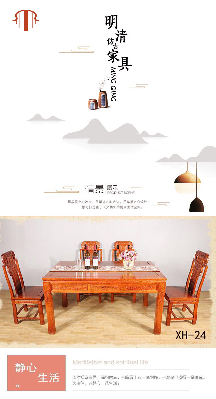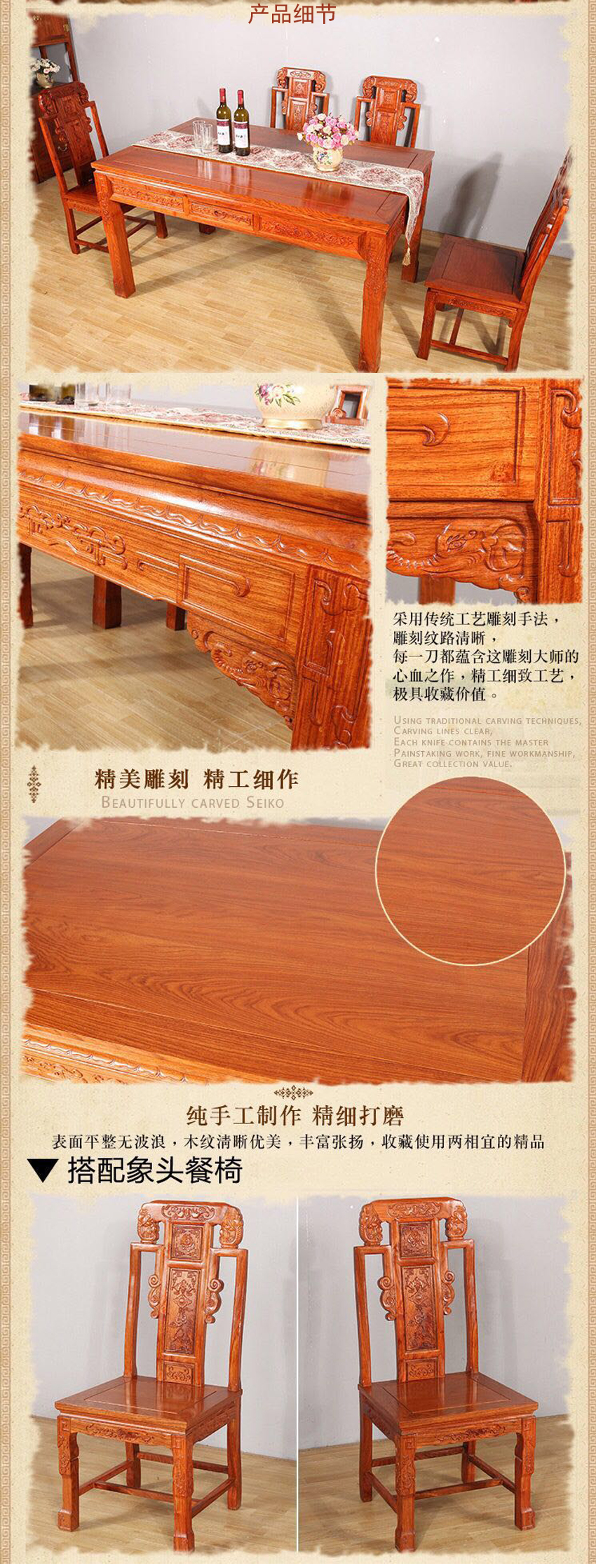 4. 产品简介:此款家用老榆木餐桌椅拥有 美观的木纹,富有变化,有生命的韵律感,这一点是人工无法比拟的。中式仿古实木餐桌是 木材切割打磨而成,未添加化学粘合剂,, 健康;这款长 餐饮古典餐桌具有 的承重性,不易发生老化开裂的现象,不易折断,能够使用。老榆木家具通过热弯、拼接、雕刻等技术让其富有收藏价值。