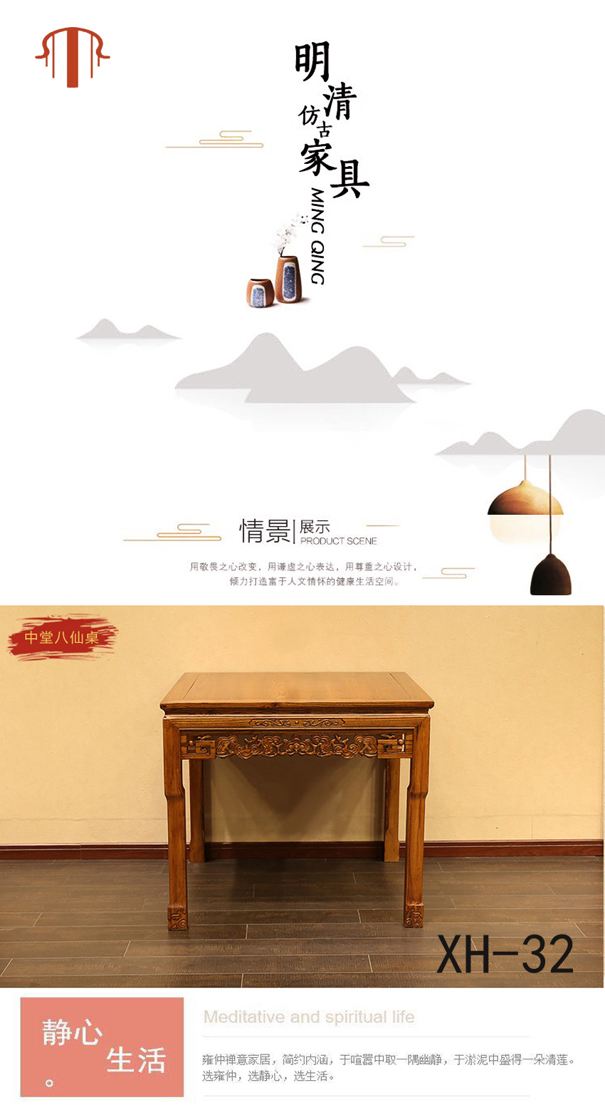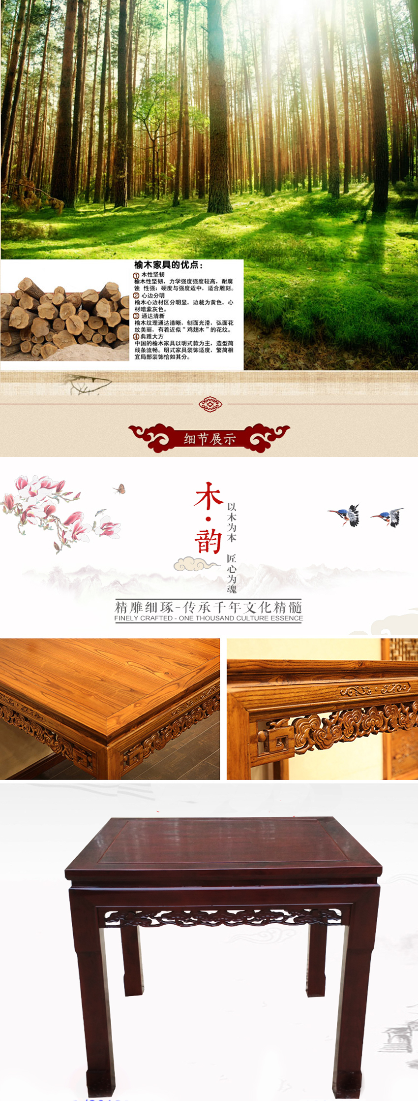 4. 产品简介:这款老榆木方形餐桌是星河老榆木中式实木餐桌系列中的一款,结构造型为正方形的桌面,可供四人共同使用,桌面下部有雕刻镂空图案,古香古色,可以当做餐桌还能当做茶台使用,是一款非常有 性价比的老榆木餐桌椅茶台产品。