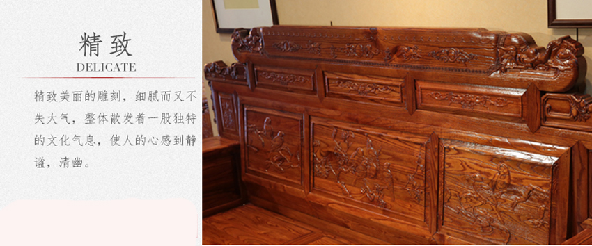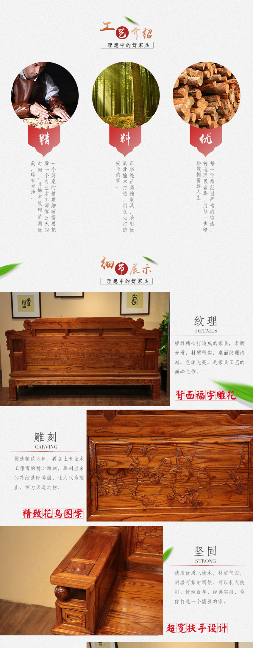 5. 产品描述:老榆木财源滚滚沙发,沙发整体采用北方老榆木材质制作,原材料经过 木材烘干房30-40天的烘干加工,让木性达到了稳定不易变形的状态,; 木工师傅和设备的打磨雕刻,此款 老榆木沙发六件套的滚球圆润,雕刻立体清晰;环保木器漆均匀喷涂,健康无味道、无堆积现象产生,此款老榆木家具沙发适合摆放在客厅、会所,彰显成熟大气的文化感。星河老榆木家具厂家一直秉承“弘扬 中式文化,做中国好家具”的经营理念,为您提供健康环保的老榆木家具!