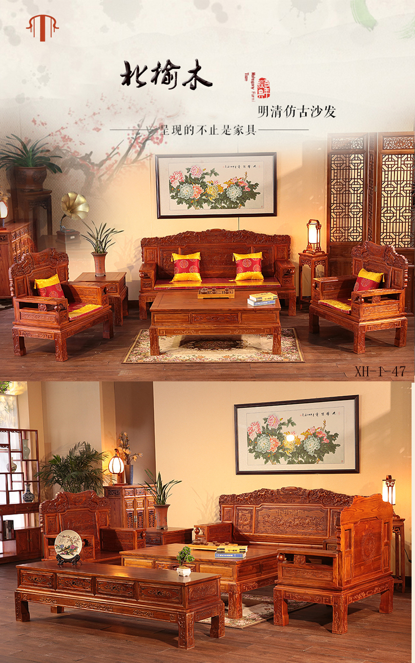 5. 产品介绍:此款仿明清榆木沙发,造型稳重、大方,北方老榆木材质生产,坚持木材本身的自然纹理,比例尺寸合度,轮廓舒展漂亮,非常大气;这款中式老榆木实木沙发创作源于名画家徐悲鸿的代表作: 八骏图,明清仿古老榆木实木家具沙发三人位靠背八匹英姿勃勃的骏马,正有力的飞奔向前,匹匹姿态不同,个个雄健精神;沙发的靠背顶部也有骏马的雕刻,让整套老榆木宝马沙发浑然大气,象征事业奔 腾向前、蒸蒸日上!