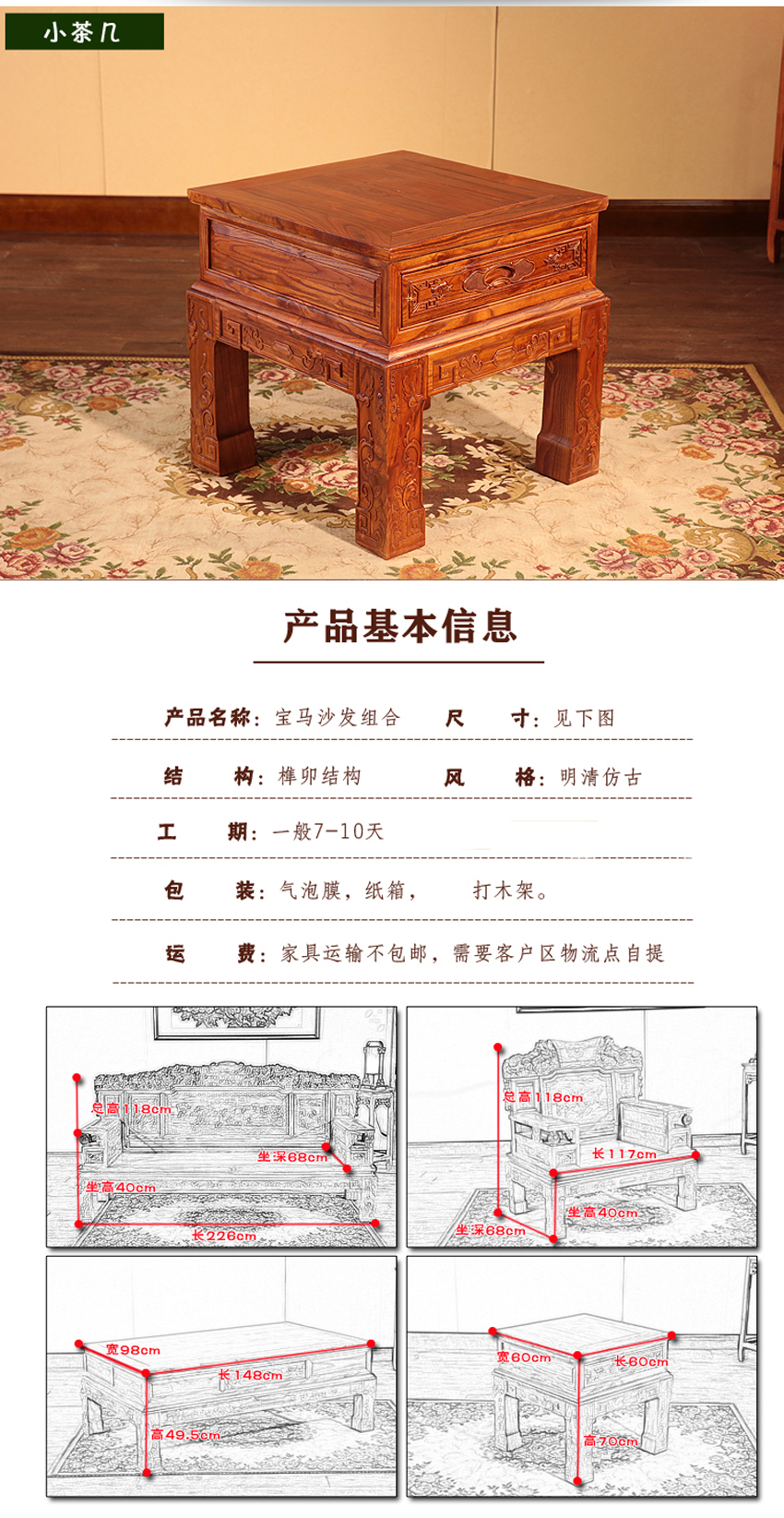 1. 产品材质:三人位、单人位、茶几均为榆木