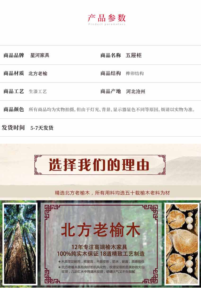 4. 产品简介:星河老榆木家具五屉柜 款式,此款榆木五层抽屉收纳柜,采用环保无味的油漆, 北方老榆木,榆木五屉柜简单优美大气,五个大抽屉设计实用,雕花装饰 能凸显中式福贵感,是家 庭、豪宅、会所的中式实木卧室家具产品,用心的造型设计,整体结构韵美,具有很高的艺术风格,星河中式榆木家具免费咨询热线:0317-8192196
