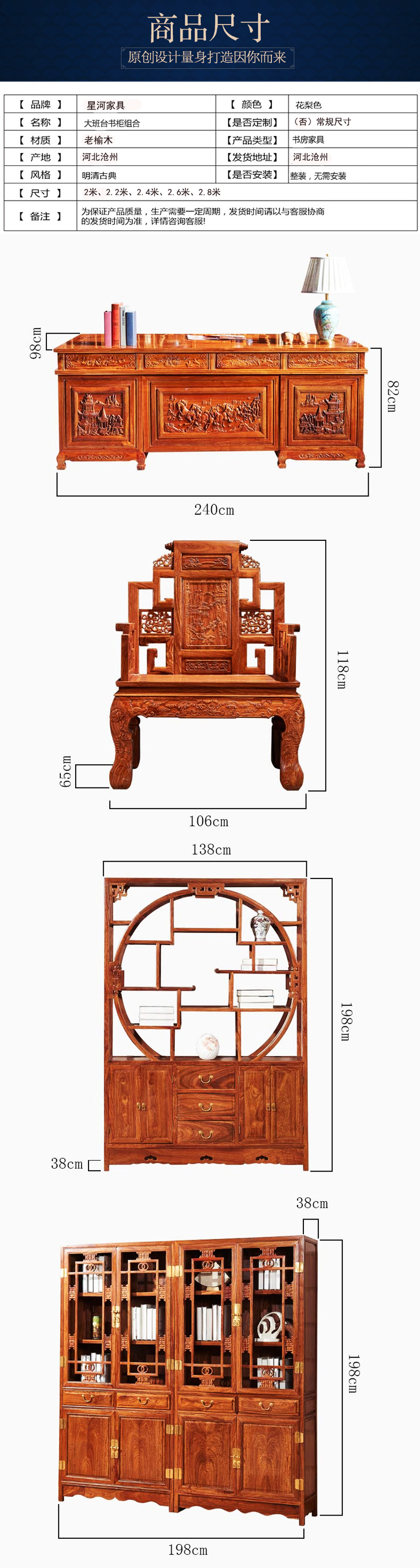 4. 产品简介:好产品关注每一个细节,这款老榆木现代中式写字台有着的雕刻工艺,纹理沉着、美观大气,造型线条流畅手感顺滑,富有诗情画意之美。