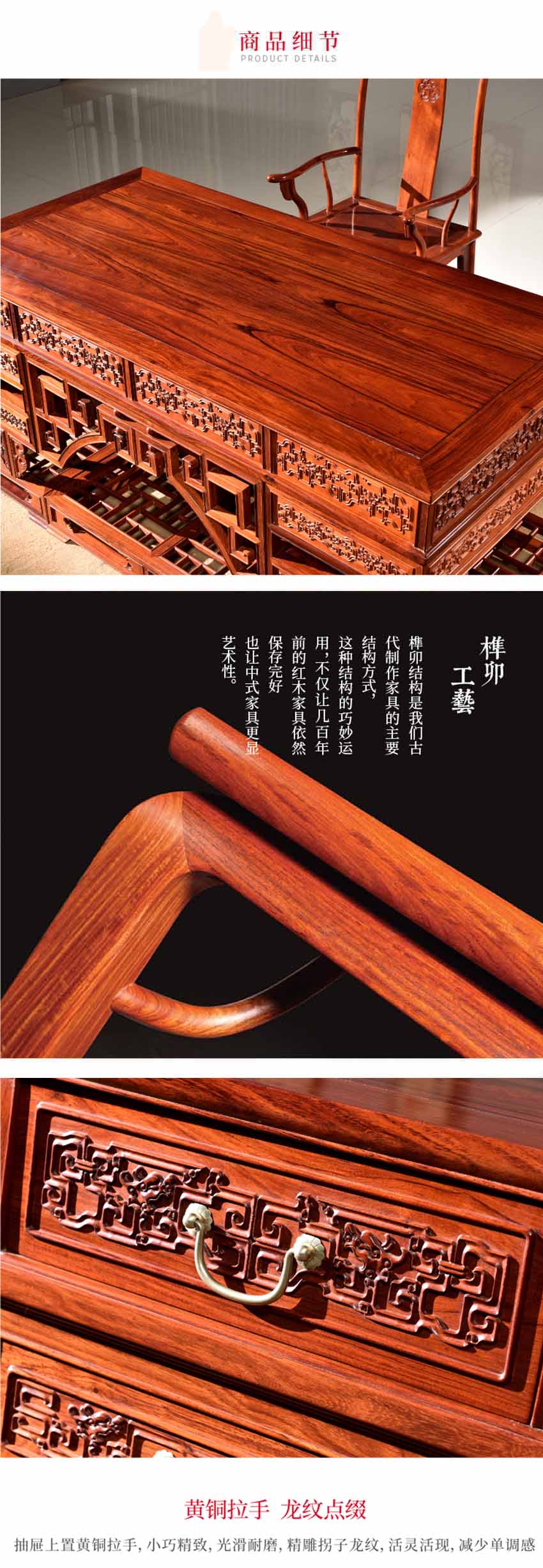 4. 产品简介:好产品关注每一个细节,这款老榆木现代中式写字台有着的雕刻工艺,纹理沉着、美观大气,造型线条流畅手感顺滑,富有诗情画意之美。