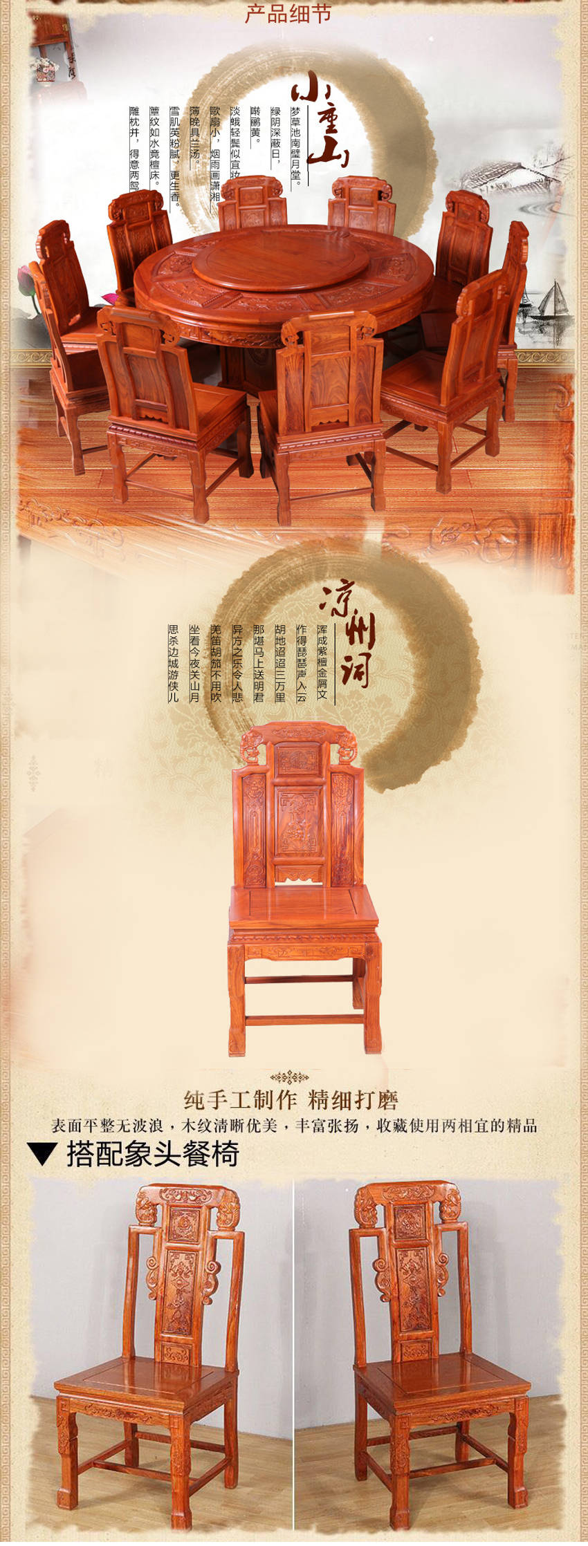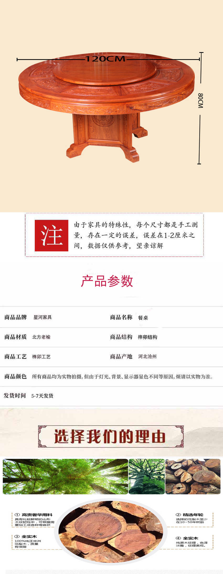 产品简介:您还在找饭店包间老榆木圆餐桌吗?这款老榆木酒店圆餐桌,就是您的选择,这款酒店包间圆餐桌直径一米六,适合在中等大小的酒店包间使用,此款中式酒店包间圆桌整体采用老榆木材质,桌面有深浮雕雕刻图案,凸显中式气息,很好的提升坐在空间场所的档次,桌腿采用包厢设计,美观大气,还可以防止杂物的掉落,方便清理。