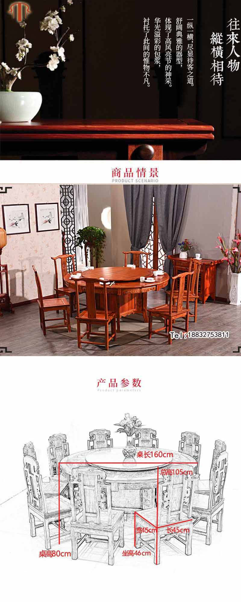 3. 产品简介:这款老榆木餐桌尺寸可定制,是酒店,宾馆常用的款式,适合6-8人就餐使用。沧州星河老榆木家具厂, 从事老榆木酒店餐桌椅批发。