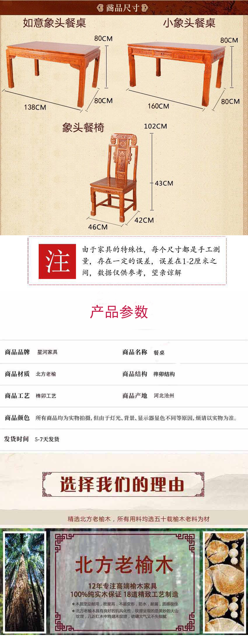 4. 产品简介:此款家用老榆木餐桌椅拥有 美观的木纹,富有变化,有生命的韵律感,这一点是人工无法比拟的。中式仿古实木餐桌是 木材切割打磨而成,未添加化学粘合剂,, 健康;这款长 餐饮古典餐桌具有 的承重性,不易发生老化开裂的现象,不易折断,能够使用。老榆木家具通过热弯、拼接、雕刻等技术让其富有收藏价值。