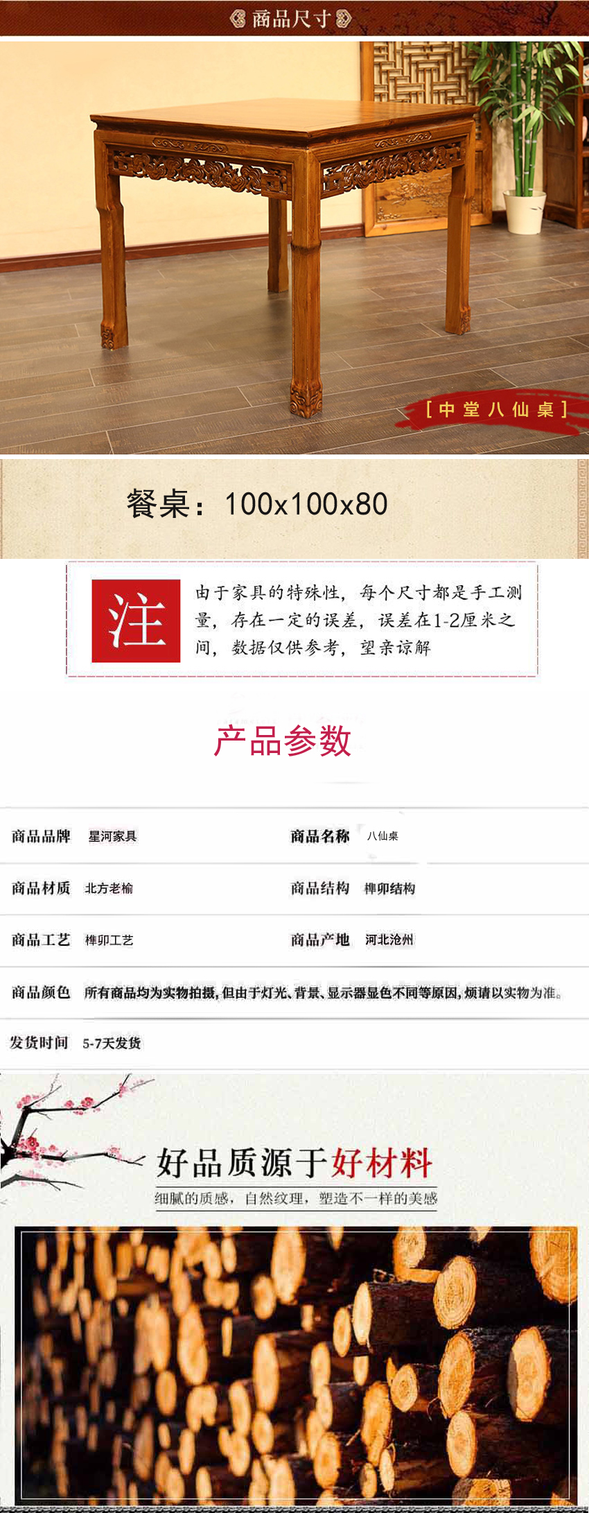 4. 产品简介:这款老榆木方形餐桌是星河老榆木中式实木餐桌系列中的一款,结构造型为正方形的桌面,可供四人共同使用,桌面下部有雕刻镂空图案,古香古色,可以当做餐桌还能当做茶台使用,是一款非常有 性价比的老榆木餐桌椅茶台产品。
