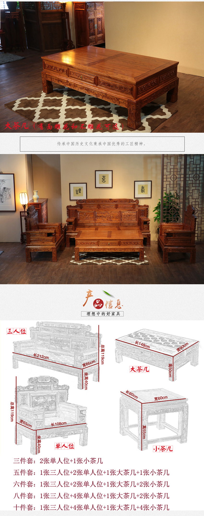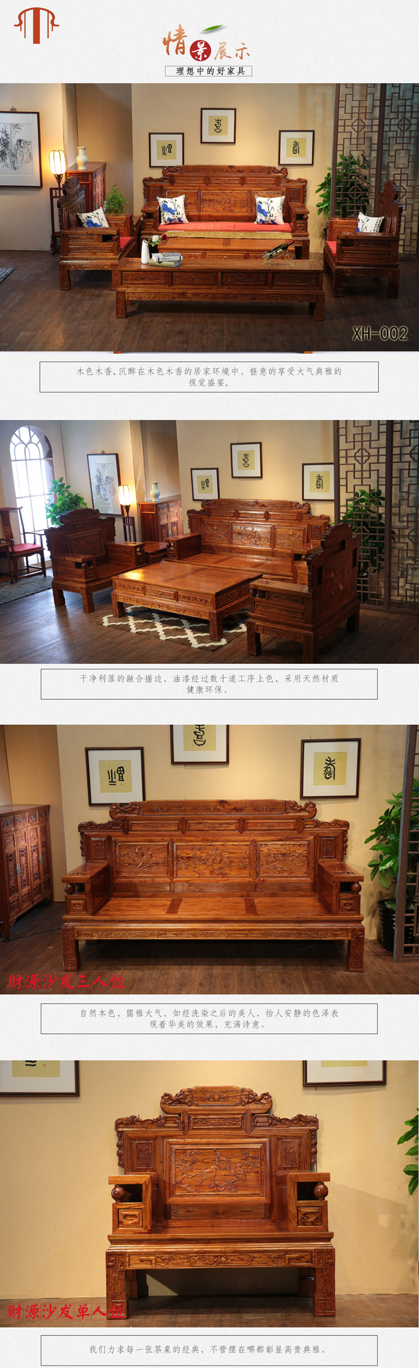5. 产品描述:老榆木财源滚滚沙发,沙发整体采用北方老榆木材质制作,原材料经过 木材烘干房30-40天的烘干加工,让木性达到了稳定不易变形的状态,; 木工师傅和设备的打磨雕刻,此款 老榆木沙发六件套的滚球圆润,雕刻立体清晰;环保木器漆均匀喷涂,健康无味道、无堆积现象产生,此款老榆木家具沙发适合摆放在客厅、会所,彰显成熟大气的文化感。星河老榆木家具厂家一直秉承“弘扬 中式文化,做中国好家具”的经营理念,为您提供健康环保的老榆木家具!