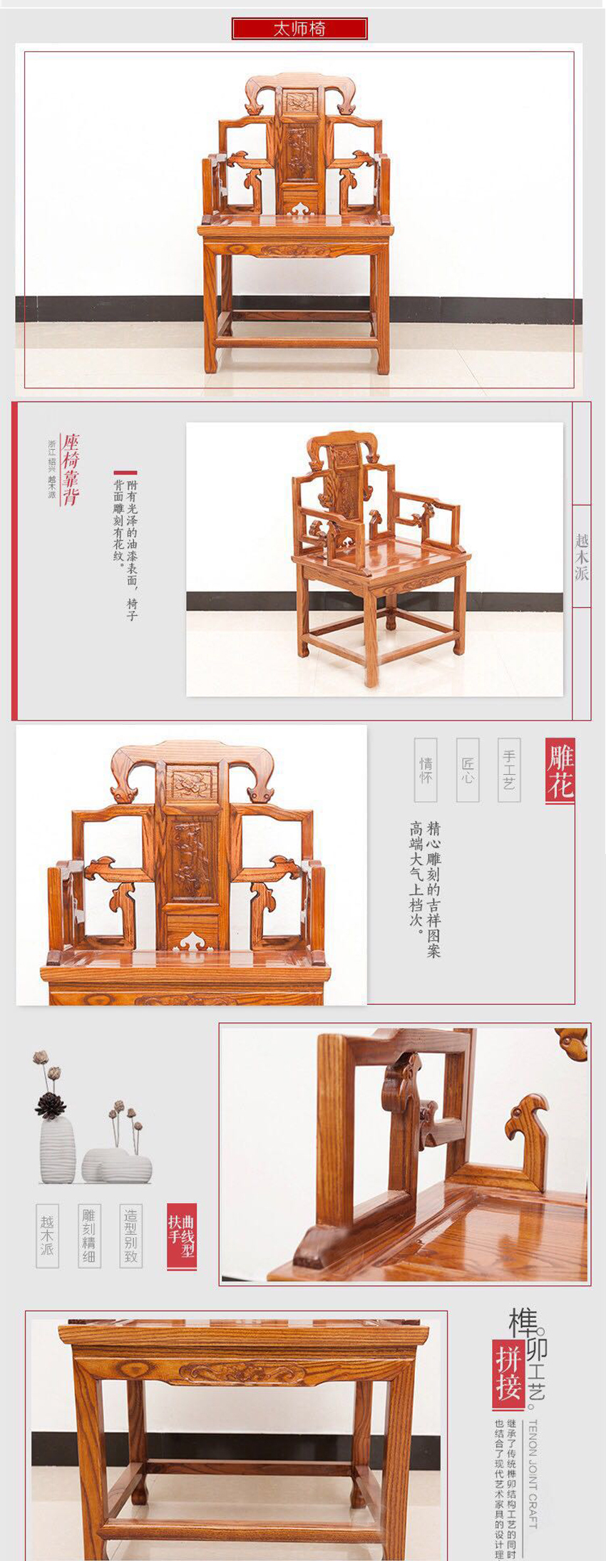 4. 产品简介:喃喃细语,禅茶意境!这款老榆木小号圈椅正是现代中式经典之作,木色深沉,回归心境! 的选材让这款老榆木古典圈椅成为了大自然的馈赠,好的家居文化共享,品质源自于严谨的工艺。这款 老榆木中堂圈椅有着传世典藏的价值,钟情于曲线的圆,结合追求支线的美,使这款榆木家具朴实大气!传统的榫卯结构扎实,坐面空间宽大承坐舒适。