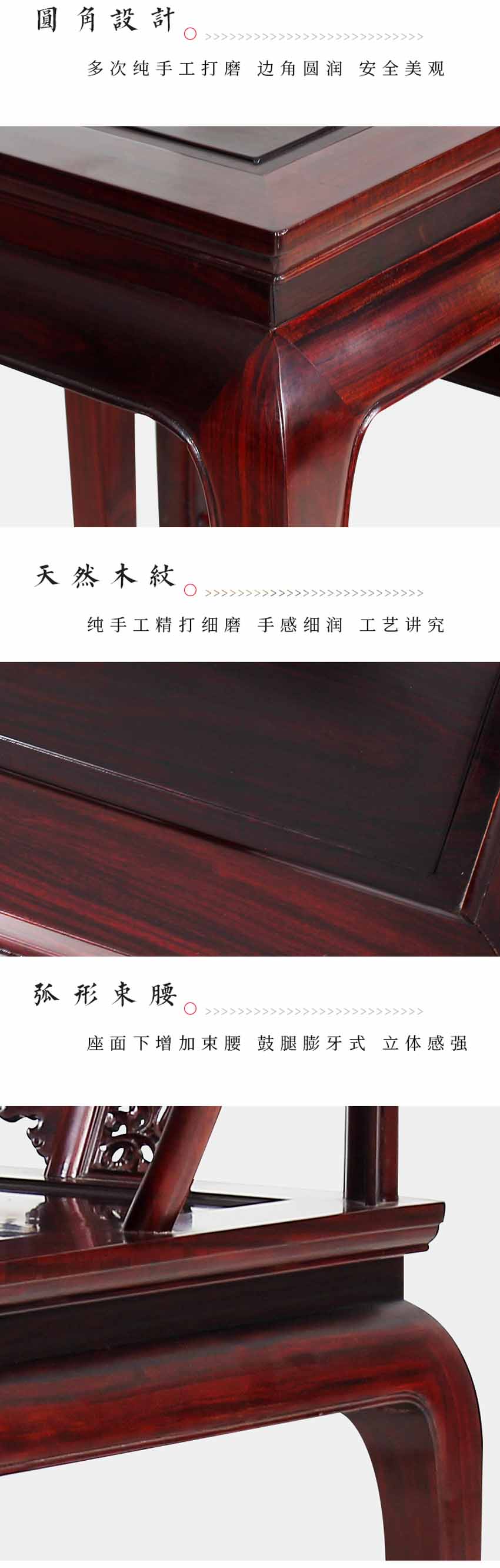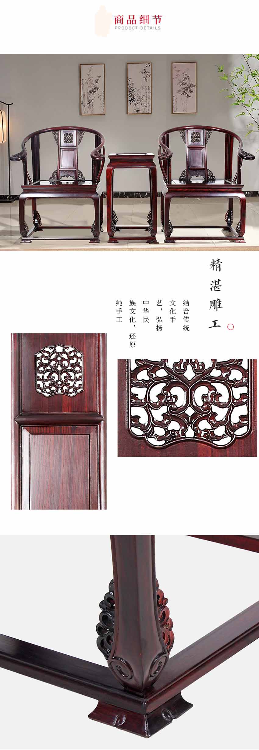 4. 产品简介:这款老榆木仿明清代圈椅,用 传统的榫卯工艺,传承中国古典家具之精髓,展现老榆木皇宫圈椅历史文化之韵味,处处体现传承中式榆木家具的魅力,这款老榆木实木三件套圈椅 匠心集古人智 慧与明清仿古老榆木家具之大成,一榫一卯都倾注了匠师的技艺和机制追求,几十年几 不变。此款圈椅雕刻华丽,工艺水平 ,受许多文人雅士追捧。