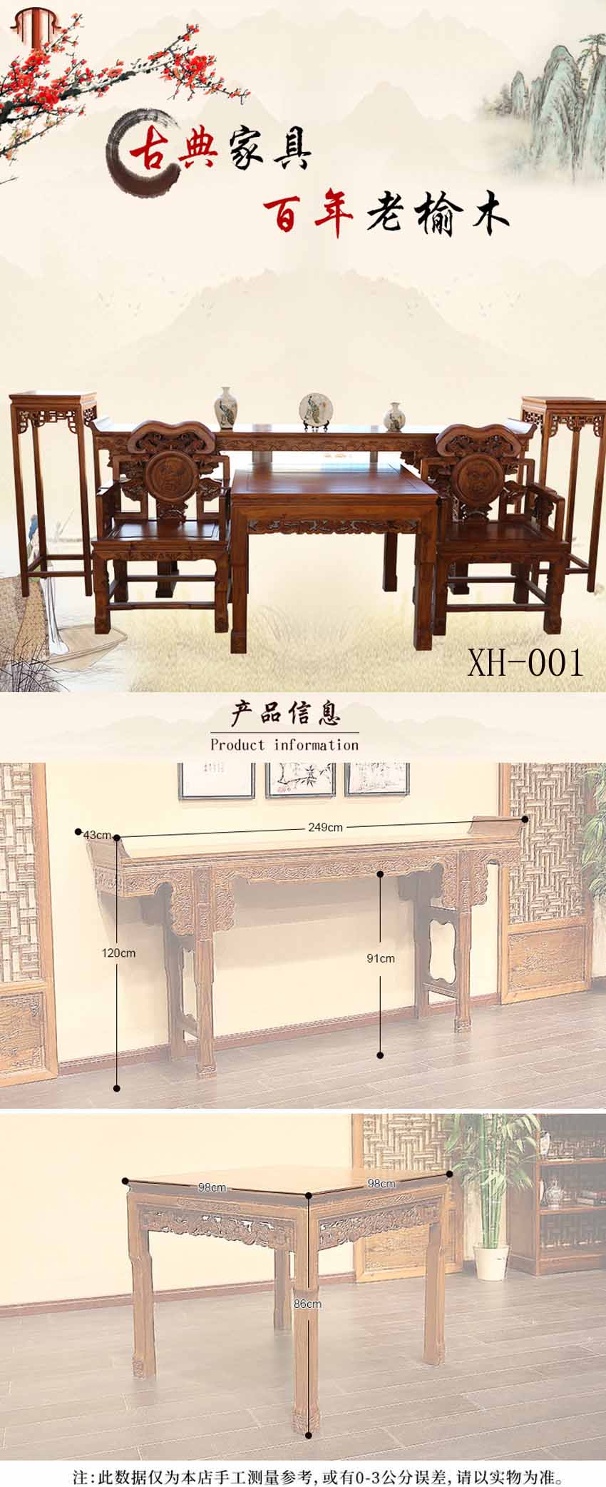 4. 产品简介:这款老榆木中堂六件套做工考究,用料充足,高品味, 。结构简单、榫卯结构,连接牢固, 工巧美。面板木纹美观,整体造型美观大气,放在屋里很有古典传统气息。沧州星河老榆木家具 批发厂家,欢迎您的光临!